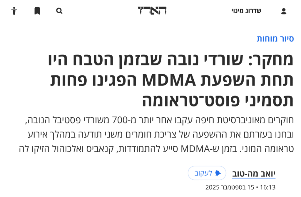 Translated from German :"Roy Salomon, co-founder of Safe-Heart and a cognitive scientist at the University of Haifa, was one of the initiators of the study. This study indicates that the drug MDMA might have a protective effect on survivors of the mass trauma. 'This is the first time we are observing a mass trauma of this magnitude under the influence of drugs,' says Salomon. Among the study participants, about half are reportedly on their way back to life after a year—a lower proportion compared to other traumatic situations but remarkable given the ongoing war."